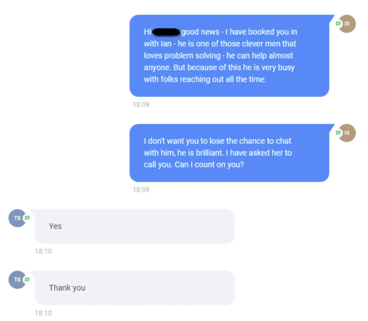 El siguiente mensaje es la clave que derriba sus defensas de "estoy demasiado ocupado" y abre la conversación por SMS.